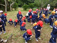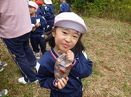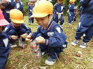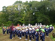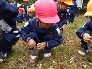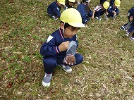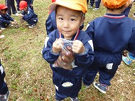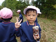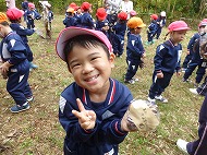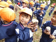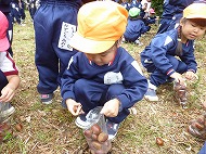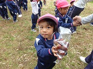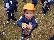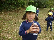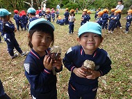 大きなくりを袋いっばい拾うことができました。お家の方に用意していただいたおにぎりを食べ、どんぐり拾いもしました。