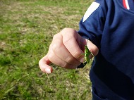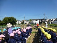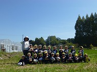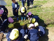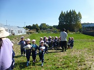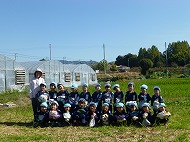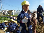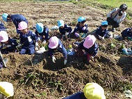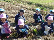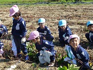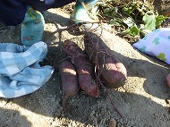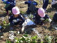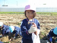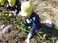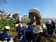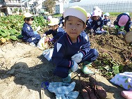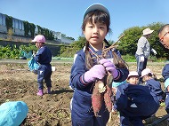 お芋の蔓のもとを掘り、大きなお芋を掘り出すことができました。先生に手伝ってもらいながら、長さ40cmほどのお芋を掘り出す園児もいました。