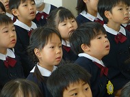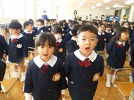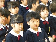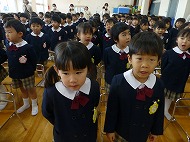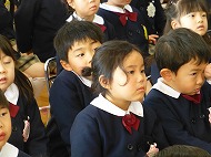 3学期は、1・2学期の成長を確かめ、次の学年へ進級・就学の喜びや楽しみをもって園生活を過ごしましょう、というお話がありました。正月飾り、羽子板、凧についてのお話もありました。「ちゅうちゅうねずみ」「園歌」を歌いました。