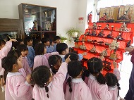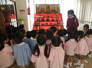 2階に飾ってあるひな飾りを各クラス順番に見学しました。見学時、担任の先生からお内裏さま、三人官女、五人囃子など、ひな飾りの説明を受けました。またお部屋で「うれしいひなまつり」を歌ったり、カルピスをいただき楽しくひなまつり会を過ごしました。