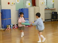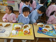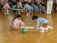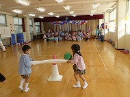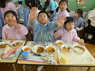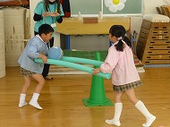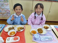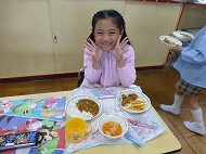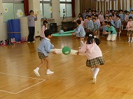 「ボール運び競争」「いそいでくぐれ!フープわたしリレー」「みんなで協力!巨大パズルゲーム」を行い、みんなで楽しく過ごしました。給食も特別メニューを考えてくださり、おいしくいただきました。
