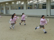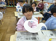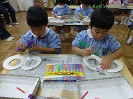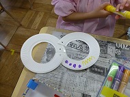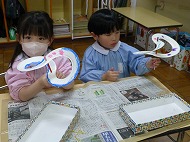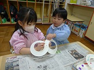 内容は、「『8の字風車』作りに取り組み、遊びを楽しむ」です。「絵画制作展を終え、自分たちで作ったもので遊ぶことを楽しむ姿が増えたので、制作から遊びに繋がる活動をさらに広めたいと考えた」、また「友だちと協力しながら作る経験をしたり、友だちの作品を互いに認め合うことで関係を深めるきっかけを作りたい」を設定理由にしました。
