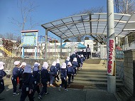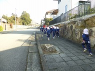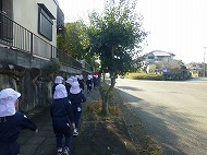 園児たちがコース確認や道路の状況確認のため歩行を行いました。各学年コースが異なり、年少、年中、年長の順に距離が長くなります。練習、当日を含め健康観察、交通安全を十分確保し行います。
