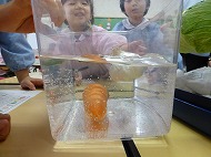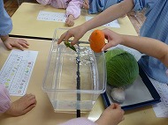 内容は、「水を使った実験遊び」です。「普段の保育の中で『どうして?』『なぜ?』と身近な事象に興味を持ち、疑問を言葉にする姿が多く見られる。そこで言葉の説明だけではなく、実際に体験しながら試したり比べたりする経験を通し、自ら気付き、考える力を育てたい」と考え設定理由にしました。