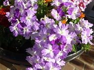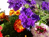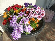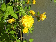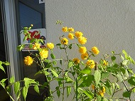 やまぶきの花が咲きました。近隣の方からわけていただき、用務員さんがフラワーポットに植えかえたものです。濃い黄色の花です。もう一つのフラワーポットには、バーベナの小さな花々が咲いています。フラワーポットは玄関両脇にあります。