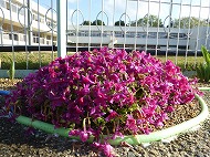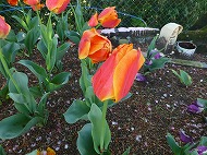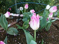 道路沿いの石垣には芝桜、園の花壇にはチューリップが、昨日の雨にもまけず咲いています。