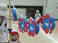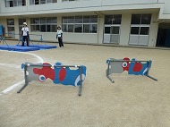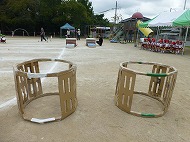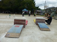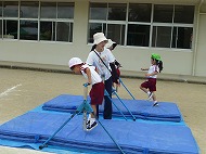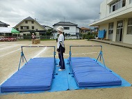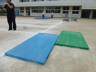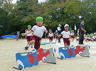 マット、ハードル、鉄棒、大屋根リングくぐり、跳び箱、タンバリンタッチを越えたり跳んだりします。用具には「大阪関西万博」にちなんだ装飾もしています。子どもたちは懸命に走り、越え、跳び、練習しました。
