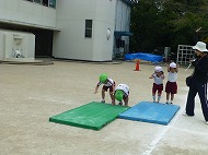 年長さん、障害物競走の練習。園庭で初めての練習です。