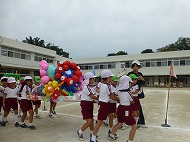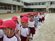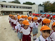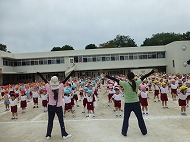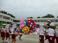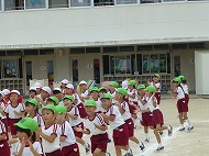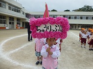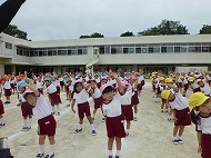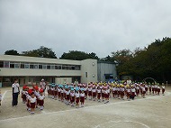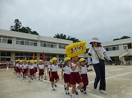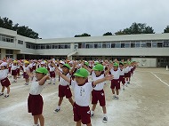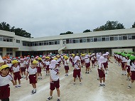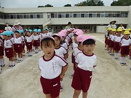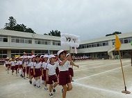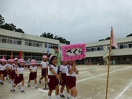 全学年で行いました。開会式行進の先頭は「ひらのエキスポ2025」のおみこしです。年長、年中、年少の順に元気よく歩き、並び、うたや準備体操を行いました。