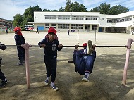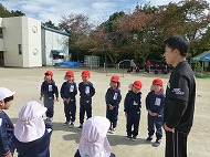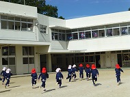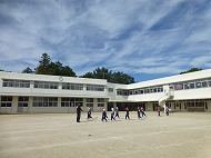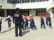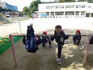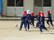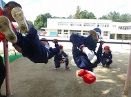 鉄棒、逆上がりを練習しています。なかなか難しそうです。サッカー、広い園庭で思いきりボールを追いかけます。