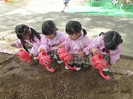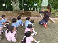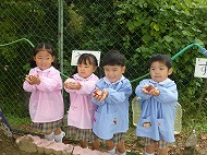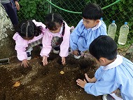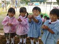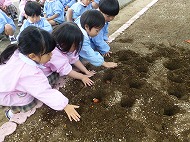 球根を手のひらに配ってもらい、形や色、匂いなどを観察し、花壇に植え付けました。3月・4月にどんな色・形のチューリップが咲くか楽しみです。