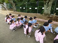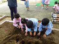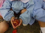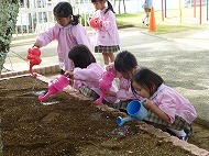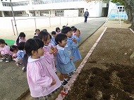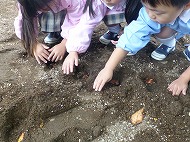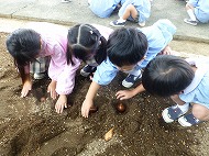 球根を手のひらに配ってもらい、形や色、匂いなどを観察し、花壇に植え付けました。3月・4月にどんな色・形のチューリップが咲くか楽しみです。