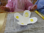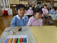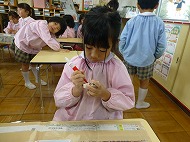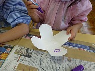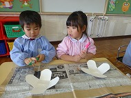 お正月あそびの道具を整えました。こまに色を塗ったりデザインを施しました。また、牛乳パックを利用してこまを作ります。体育あそびも、はじまりました。いろいろな動きととび箱をしました。