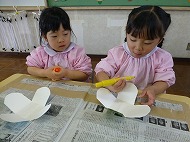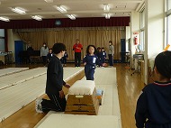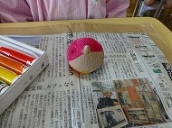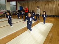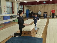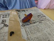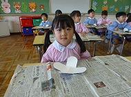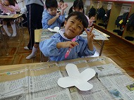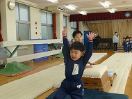 お正月あそびの道具を整えました。こまに色を塗ったりデザインを施しました。また、牛乳パックを利用してこまを作ります。体育あそびも、はじまりました。いろいろな動きととび箱をしました。