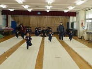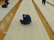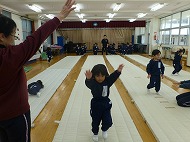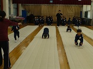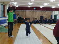 年少さん、体育あそび。フットワーク・前転・とび箱をしました。
