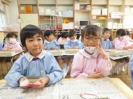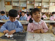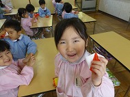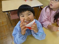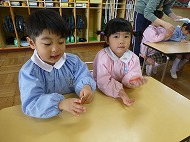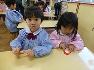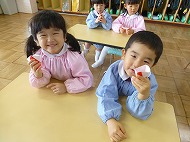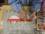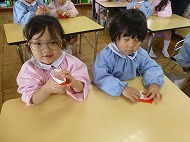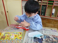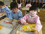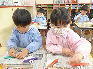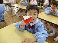 年少さん、「豆を入れる袋」を折り紙で作りました。