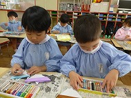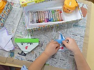 年中さん、「こま」を作りました。制作帳に貼ります。