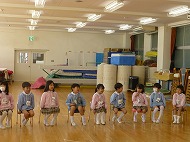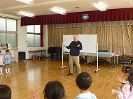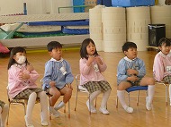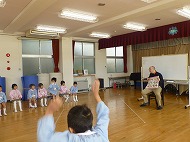 年長さん、英語です。「ABCのうた」を歌ったり、今日の天気について先生とやりとりをし楽しく英語にふれました。