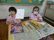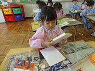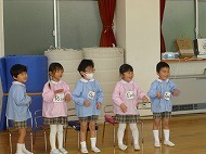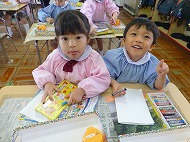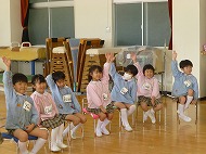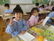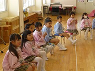 年長さん、英語です。「ABCのうた」を歌ったり、今日の天気について先生とやりとりをし楽しく英語にふれました。