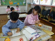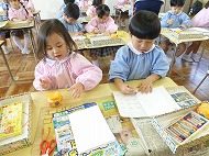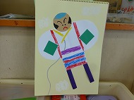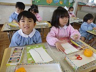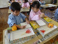 年少さん、画用紙を切って制作帳に貼り、色をつけ凧を作ります。