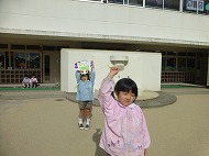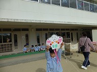 年中さん、凧あげです。凧を高くあげました。よくあがった人もいました。