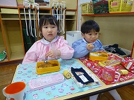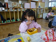 年少さん、給食。メニューはポークカレーです。