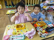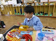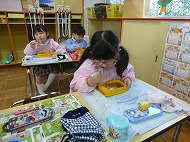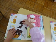 年長さん、絵本の中にある制作です。絵本に掲載されている“チョコレート羽根の蝶々”を制作しています。