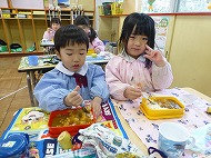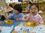 年少さん、給食。メニューはポークカレーです。