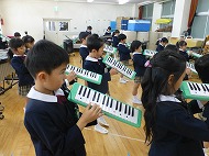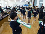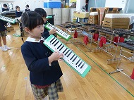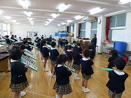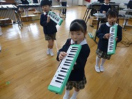 年長さん、音楽です。2月7日(土)「器楽合奏2026」で発表します。本日、音楽の先生に発表前最後の指導をしていただきました。