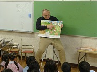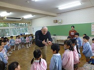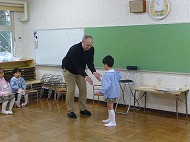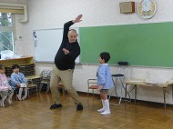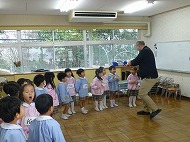年中さん、英語です。1から10を英語で数え10番目の人がすわり、最後まで残った人が「勝ち」というゲームをしました。