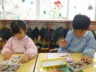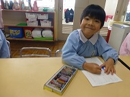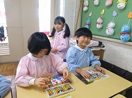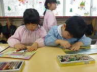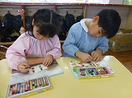 年長さん、制作です。2月のカレンダーに貼る絵を描いています。