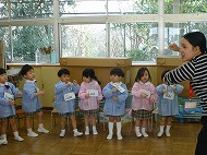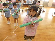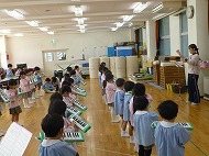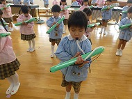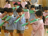 年中さん、合奏です。生活発表会の合奏曲を音楽の先生に指導していただきました。