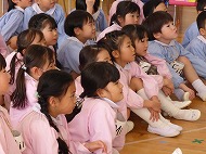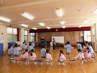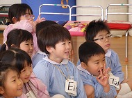 年長さん、英語です。英語の絵本を読んでもらいました。楽しく椅子取りゲームもしました。