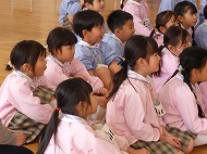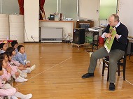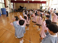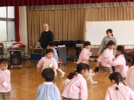 年長さん、英語です。英語の絵本を読んでもらいました。楽しく椅子取りゲームもしました。
