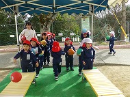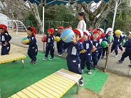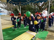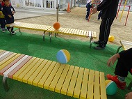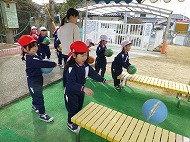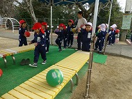 年少さん、体育あそびです。ボールを使った体育あそびです。ボールの扱いが難しいです。