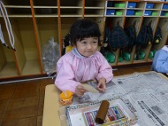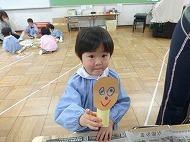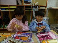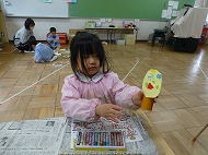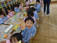 年少さん、制作です。3月の壁面飾りを作っています。