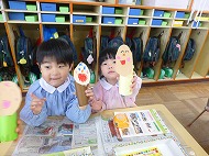 年中さん、英語です。今日の天気を英語で発音したり、楽しく英語にふれることができました。