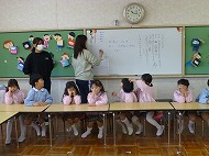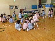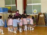年中さん、英語です。「〇〇色、〇〇先生に集まりましょう!」のゲームなどをしました。