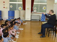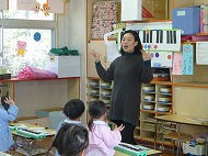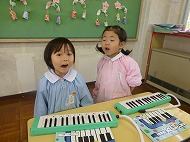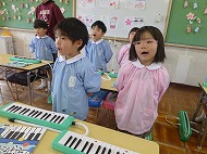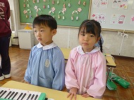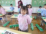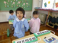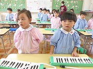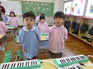 年少さん、音楽です。楽しく鍵盤ハーモニカを教えていただきました。