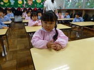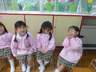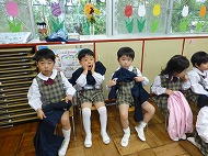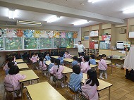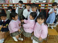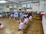 年中さん、朝の会。制服などの置き場所を確かめました。今日の連絡、うたを歌ったりしました。