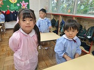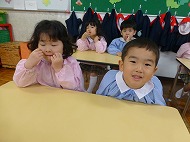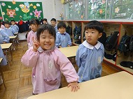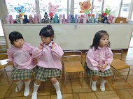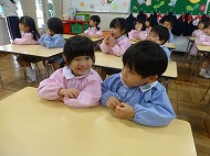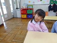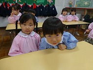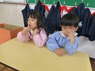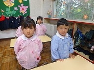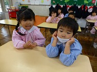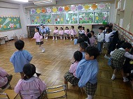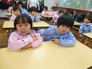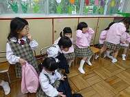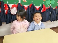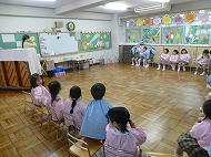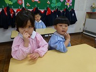 年中さん、朝の会。制服などの置き場所を確かめました。今日の連絡、うたを歌ったりしました。