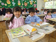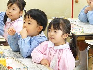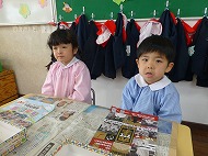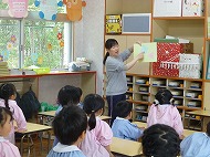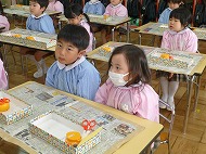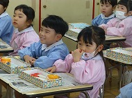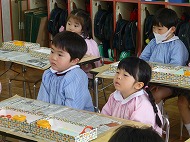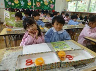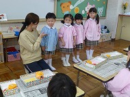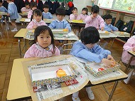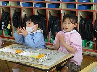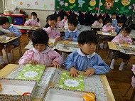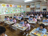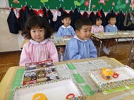 お誕生日会で「自己紹介」をする練習。制作で「はさみ・のり」を使う練習、をしました。