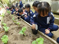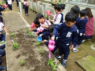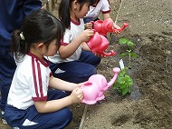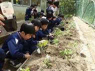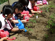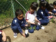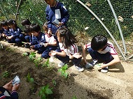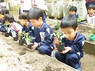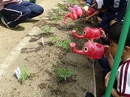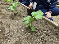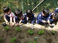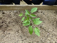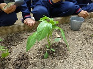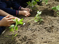 園の畑に野菜の苗を植えました。トマト、ピーマン、きゅうりなどの苗です。6月から7月に実がつくよう、水やりなどをして育てていきます。