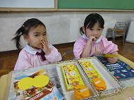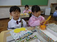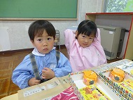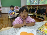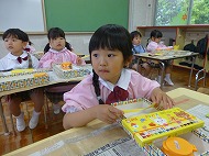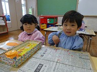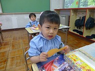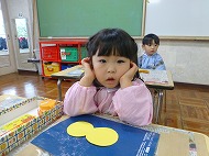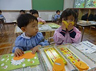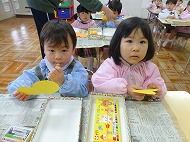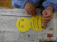 形に切ってある用紙に絵を描き、台紙に貼ります。形・絵のテーマはクラスにより異なり、ミツバチ、まめなどです。