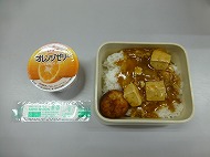 本日の給食は、「マーボー豆腐丼」「揚げたこ焼き」「オレンジゼリー」です。
