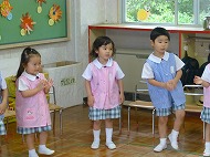 今日は音楽の先生に来ていただく日です。「ドレミのうた」「ピクニック」の曲に合わせ、体を動かしました。楽器演奏はすずで演奏をしました。音楽に楽しく接することができました。