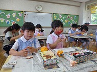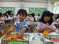 「ほしまつり」の和太鼓演奏の練習です。いろいろな人が、いろいろな太鼓・楽器を演奏しています。制作は、7月の壁面(へきめん)飾りを作っています。7月は七夕のおり姫・彦ぼしを作ります。細かい作業もあります。