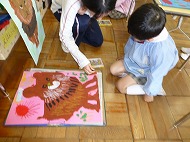 年中さん、ピアニーの練習、絵画の続き、音楽の先生と歌などのおけいこです。