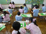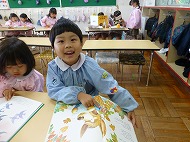年中さん、絵画制作展に向けて版画などを作製しています。年少さん、マット運動・とび箱をしました。