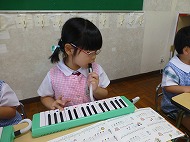 英語で「ゴー!」「ストップ!」と動いたあと、英語の絵本を観ました。音楽あそびでは、ピアニー(鍵盤ハーモニカ)で演奏をしました。